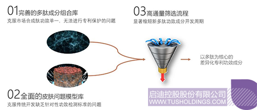 1)完善的多肽成分組合庫,種類與組合化,克服市場合成肽功效單一,無法進行專利保護的問題;