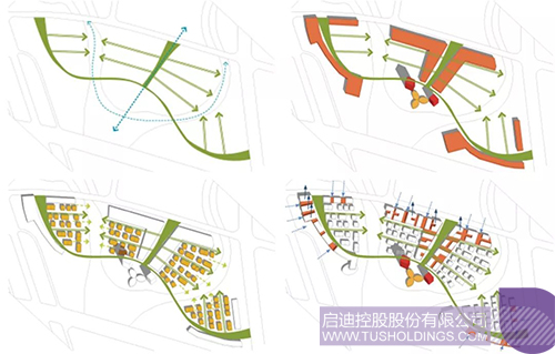 設計結合場地分析,限定周邊道路及自然景觀的的區域范圍,通過對規劃布局的軸線位置及實現通廊的分析,確定了展示中心的中軸布局形式。展示中心設置在中軸的端頭,形成視覺中心。核心區的規劃布局猶如一只飛舞的鳳凰,翱翔在神州大地;啟動區的形態正如那鳳凰的羽翼,寓意發揮啟迪控股的資源優勢。展示館則像鳳頭一樣通過建設宜產宜居的園區環境,吸引優秀的企業投資入住,帶領整個區域的產業創新與升級。核心區的規劃布局猶如一只飛舞的鳳凰。