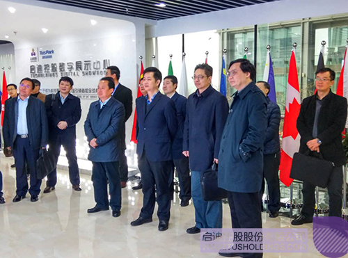 張金生副總裁(前排右一)陪同唐超副市長(前排右三)參觀啟迪控股數(shù)字展廳
