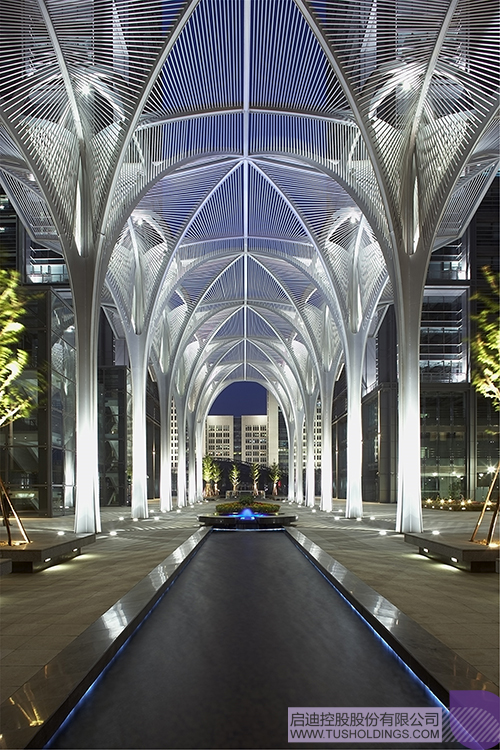 分列的四塔間隙為城市道路通向園區中心綠地打開了一條綠色通廊,中心是12顆參天鋼樹,形成灰空間的限定,與二層平臺自然的樹木共同營造出積極的公共交往空間。“樹影婆娑”下是綠意盎然的休閑廣場,展現人與自然共生共融的景象。建筑首層斜插入地下的草坪,標準層四角的綠色陽臺和頂層白色膜傘的屋頂花園無不體現了人性化、生態化的現代商務辦公理念。