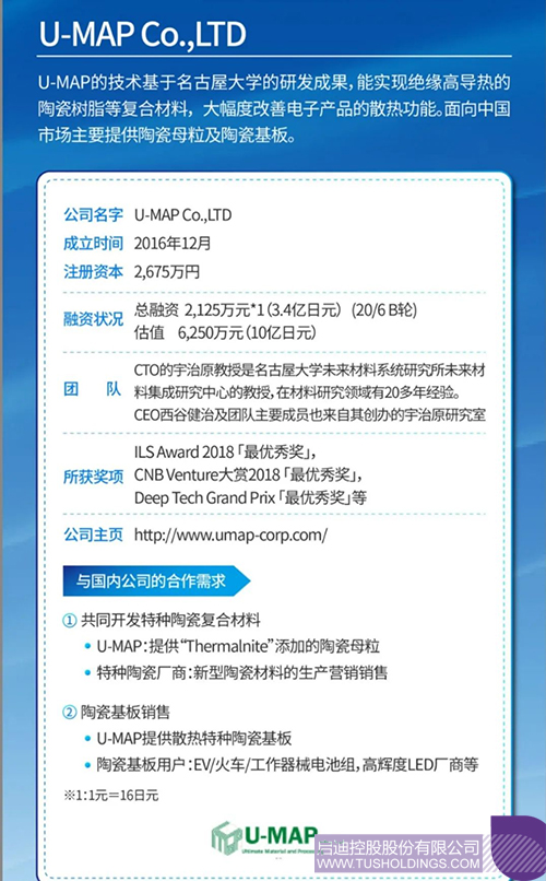 U-MAP則是基于本公司的纖維狀氮化鋁單晶添加劑“Thermalnite”,提供具有絕緣、高導熱性能的陶瓷母粒和基板。同時U-MAP也非常希望能與中國公司一道開發特種陶瓷復合材料。