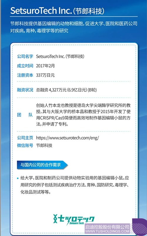SetsuroTech(節郎科技)主要面向大學、醫院和醫藥公司提供基因編輯的動物和細胞。