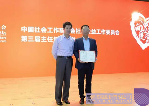 ▲  中國社會工作聯合會黨委副書記、副會長何建民(左)為新任中國公益委員會主任王濟武頒發證書