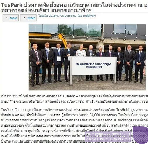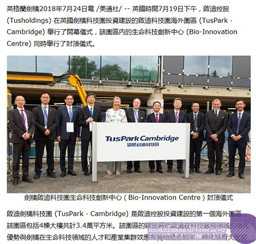 近日,由啟迪控股在英國劍橋投資建設(shè)的劍橋啟迪科技園(TusPark?Cambridge)舉辦開幕儀式和園區(qū)生命科技創(chuàng)新中心(Bio-InnovationCentre)封頂儀式,該活動在全球范圍內(nèi)引起廣泛關(guān)注,位于美國、法國、意大利、德國、英國、加拿大、瑞士、葡萄牙、俄羅斯、日本、新加坡、韓國、澳大利亞、印度、泰國、印度尼西亞、馬來西亞等國家和中國香港、澳門、臺灣地區(qū)的共計數(shù)百家媒體對此進行了不同形式的報道。